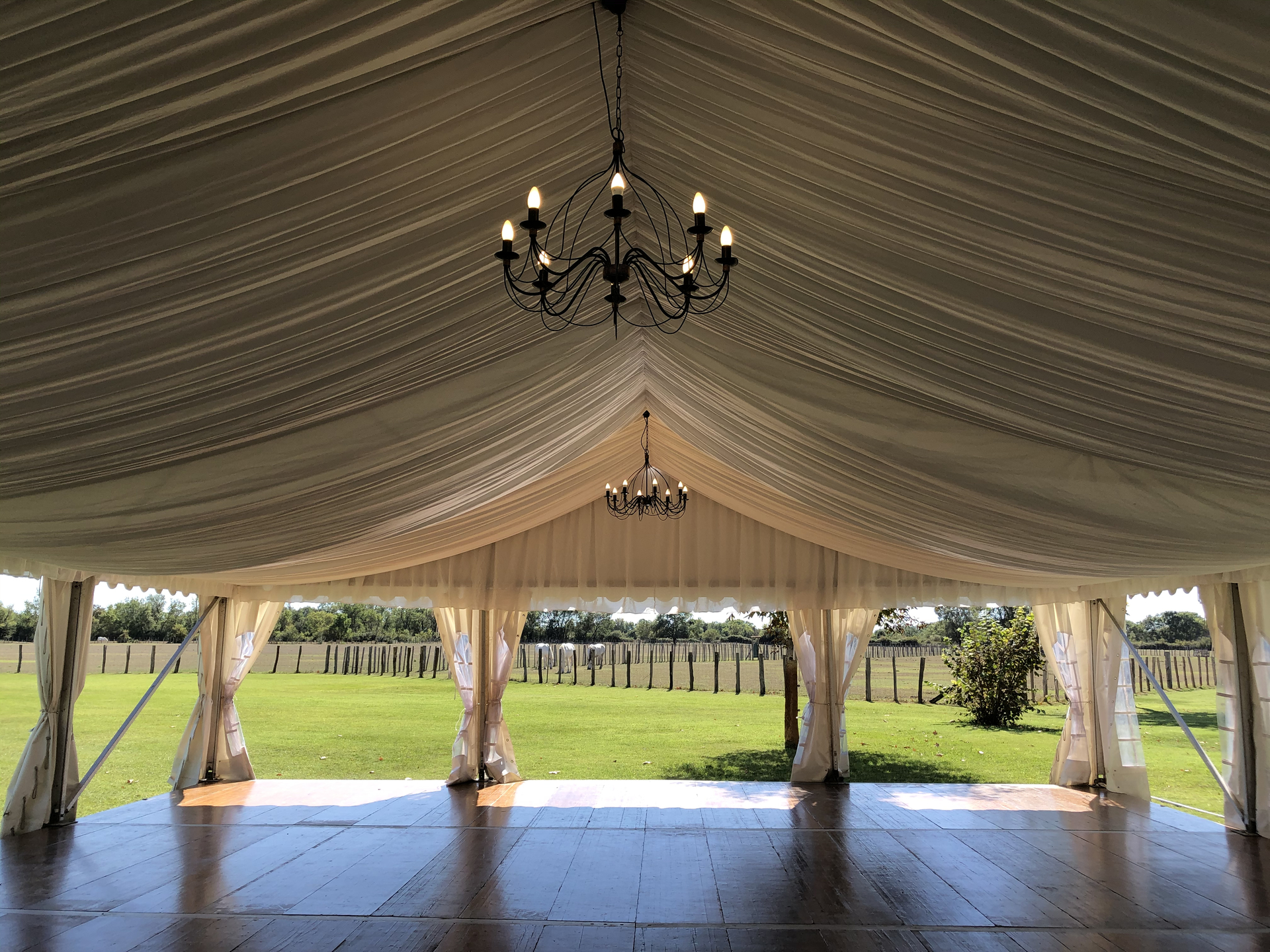 Apportez une touche de raffinement à votre chapiteau avec l'option vélum. Cet habillage textile suspendu dissimule la structure métallique du plafond de votre chapiteau tout en créant un effet drapé élégant, parfait pour un mariage, un dîner de gala ou tout événement haut de gamme. Le vélum est uniquement adapté à nos structures chapiteau de 10m de large.